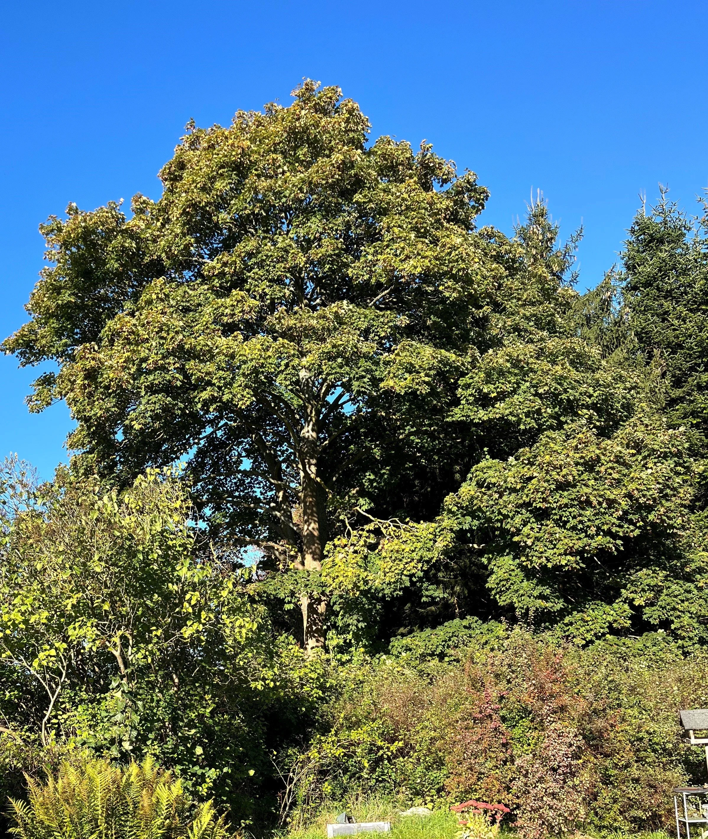 Et meget smukt asketræ, der er ca 20 m højt og med en krone på ca 13 m i diameter. Træet har 3 stammer og står i skel.